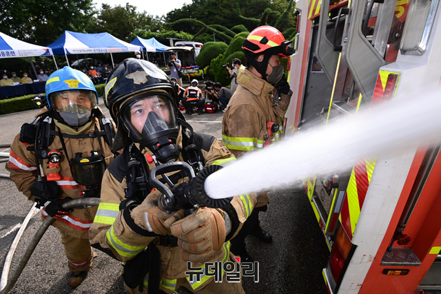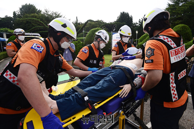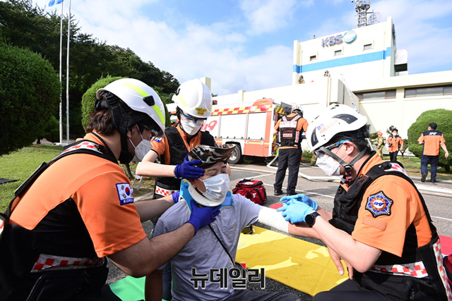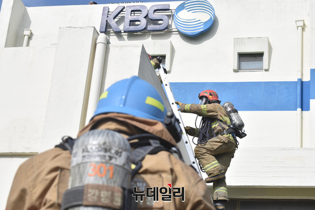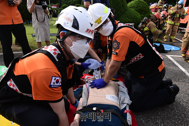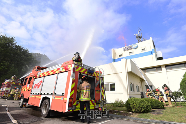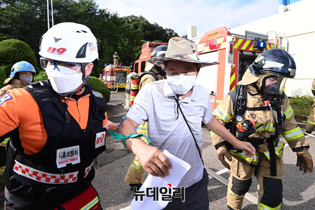 '을지 자유의 방패(UFS·을지프리덤실드)' 연합연습이 사흘째인 24일 오후 경기 시흥시 KBS소래송신소에서 열린 민·관·군·경·소방 통합훈련에서 시흥소방서 소속 소방대원들이 화재진압 및 인명구조 작전을 하고 있다.'을지프리덤실드'는 우리나라의 안전 보장과 한·미 연합 방위태세를 보존하기 위한 방어적 성격으로 진행된 연례적인 훈련이다. 문재인 정권인 2018년 이후 중단된 연대급 이상 연합기동훈련이 부활한 것이 특징이다.이날 훈련엔 51사단을 비롯해 시흥시청, 시흥경찰서, 시흥소방서, 교통안전공단, 한국전력공사 시흥지사, KT 시흥지사 등 90여 명이 참가했다. (경기 시흥=강민석 기자)