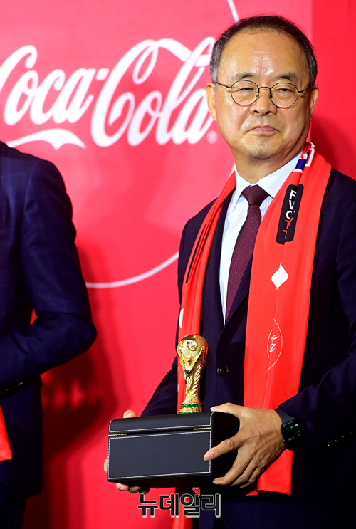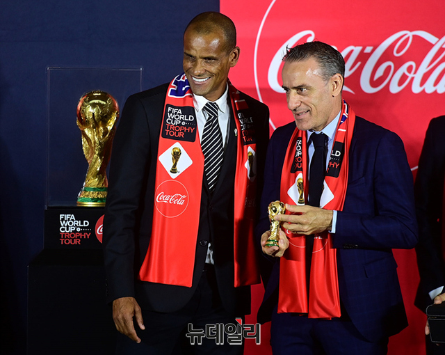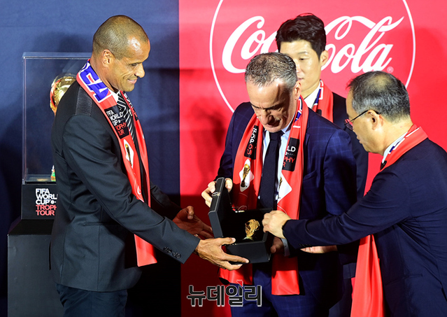 히바우두 FIFA 글로벌 앰배서더가 24일 오후 서울 여의도 더현대서울에서 열린 2022 FIFA 월드컵 트로피 투어 미디어 행사에서 파울루 벤투 한국 축구대표팀 감독에게 FIFA 트로피를 축소화 한 레플리카 트로피를 선물하고 있다.이번 피파월드컵 트로피 공개행사는 코카콜라의 '피파 월드컵 카타르 2022 트로피 투어'의 일환으로 진행됐다.트로피는 올해 본선 진출국을 포함한 전 세계 51개국을 방문한다. 아시아에서는 최초로 한국을 방문했다. 25일 소비자 체험 행사 등으로 축구팬들에게 공개 된다.