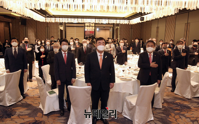 김한규 21세기 한중교류협회장(왼쪽부터), 박진 외교부장관, 싱하이밍 주한 중국대사, 임채정 한중관계 미래발전위원회 위원장이 24일 오후 서울 종로구 포시즌스호텔에서 열린 한·중 수교 30주년 기념 리셉션에서 케이크 커팅식을 하고 있다. (사진=공동취재단)