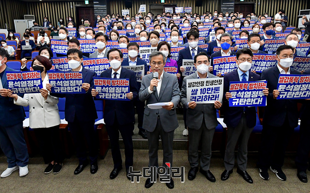 우상호 더불어민주당 비상대책위원장 및 소속의원들이 25일 국회에서 열린 의원총회에서 윤석열 정부의 쌀값 하락 대책을 촉구하며 구호를 외치고 있다.