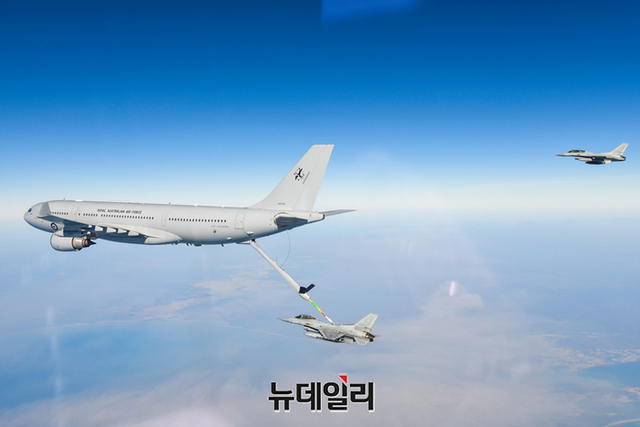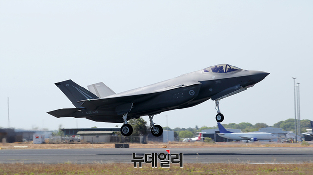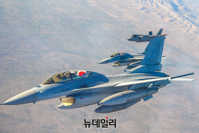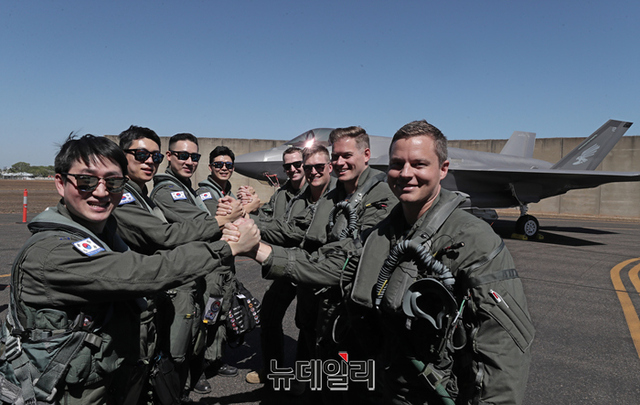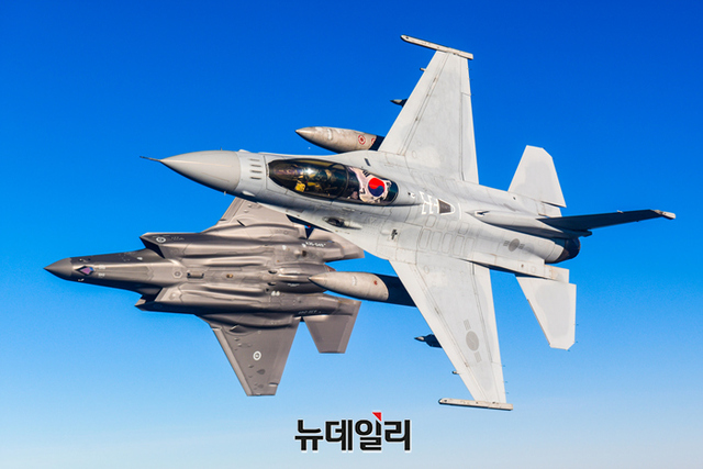 우리 공군 KF-16(위쪽)과 호주 F-35A가 24일(현지시간) 호주 상공에서 함께 편대비행을 하고 있다. 이날 한-호주 공군은 연합작전 수행능력 향상과 군사협력 증진을 위한 우정비행을 실시했다.이번 비행에는 우리 공군의 KF-16 전투기 4대, 다목적 공중급유수송기(KC-330) 1대, 호주 공군 F-35A 2대, 공중급유기 KC-30A 1대가 각각 참여했다.특히 이번 비행에는 우리 공군 KF-16 4대가 호주 공중급유기와 함께 연합 공중급유훈련을 실시하며 양국 공군간 상호운용성을 확인했다. (사진=공군)
