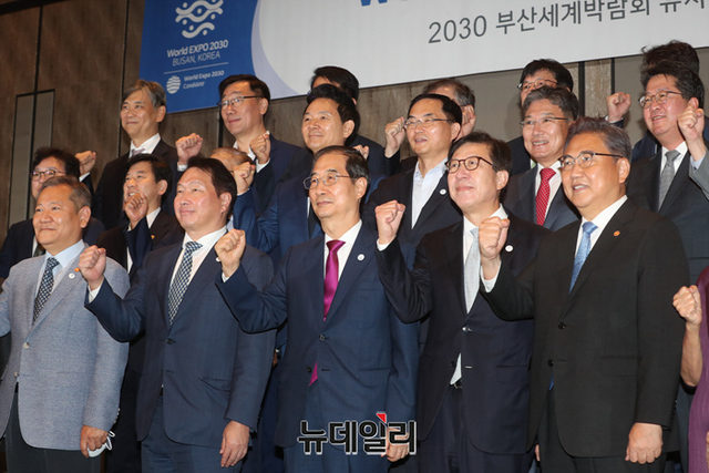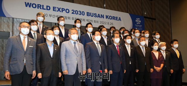 한덕수 국무총리, 이상민 행안부 장관, 박진 외교부 장관, 최태원 SK그룹 회장을 비롯한 참석자들이 26일 오후 서울 종로구 포시즌호텔 그랜드볼룸에서 열린 2030부산세계박람회 유치위원회 제2차 회의에서 기념촬영을 하고 있다.'2030부산세계박람회'는 2030년 5월 1일부터 10월 31일까지 부산 북항 일원에서 '세계의 대전환, 더 나은 미래를 향한 항해' 주제로 개최하기 위한 국제 박람회이다.이날 회의는 △유치계획서 주요 내용 및 향후계획 △위원회 운영세칙 개정(안) △유치교섭 현황 및 계획 △부산프로젝트(가칭) 추진방향 및 향후계획 △민간위원회 하반기 활동계획(안) 등의 주제로 진행된다.
