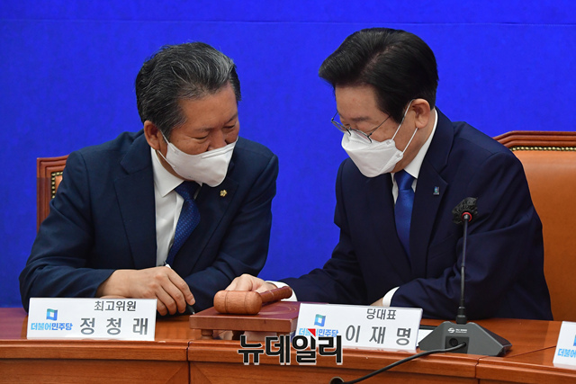 이재명 더불어민주당 신임 대표와 정청래 최고위원이 29일 오전 국회에서 열린 최고위원회의에 참석해 대화를 나누고 있다.