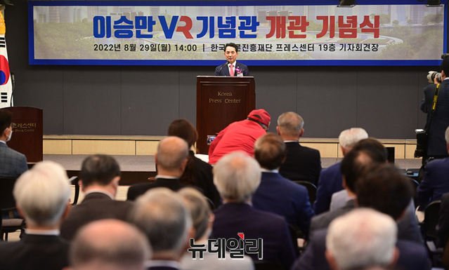 박민식 국가보훈처장이 29일 오후 서울 중구 한국프레스센터에서 열린 이승만 VR기념관 개관 기념식에서 인사말을 하고 있다.