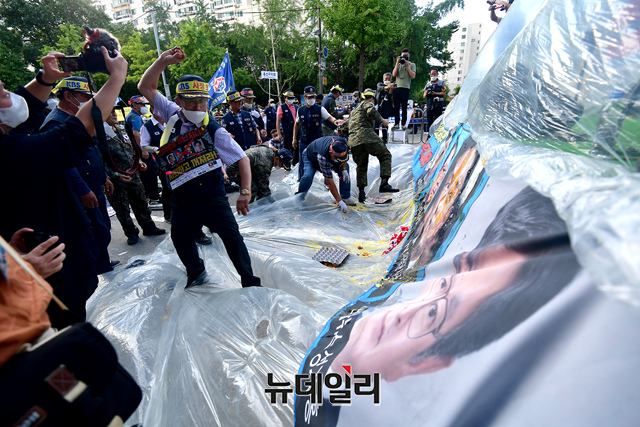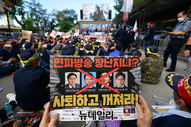 미디어연대, 월남전참전자회를 비롯한 시민단체가 방송의날을 앞둔 2일 오후 서울 여의도 63시티 앞에서 열린 '공영언론 사장 퇴진' 촉구 집회에서 참석자들이 KBS 김의철, MBC 박성제, YTN 우장균, 연합뉴스 성기홍 사장의 얼굴이 인쇄된 피켓을 들고 있다.