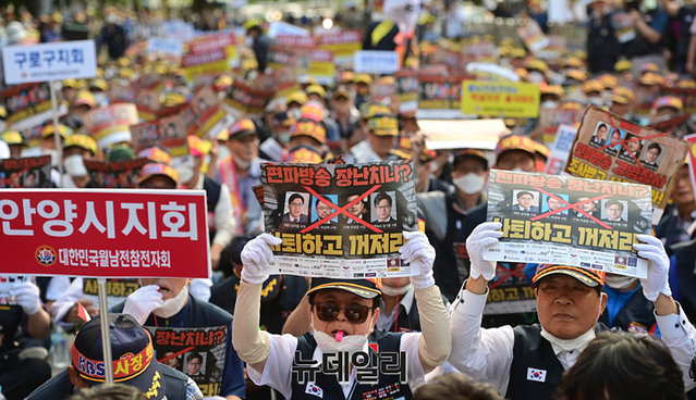 월남전참전자회가 2일 오후 서울 여의도 63시티 앞에서 열린 '공영언론 사장 퇴진' 촉구 집회에 참석해 김의철 KBS 사장의 사퇴를 촉구하고 있다. 같은시간 63컨벤션센터에는 제59회 방송의날 기념식이 진행됐다.