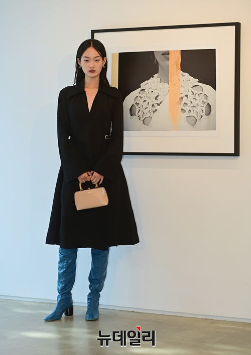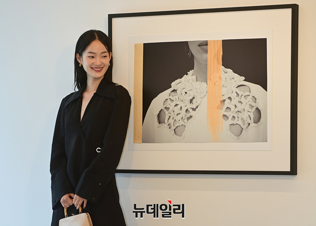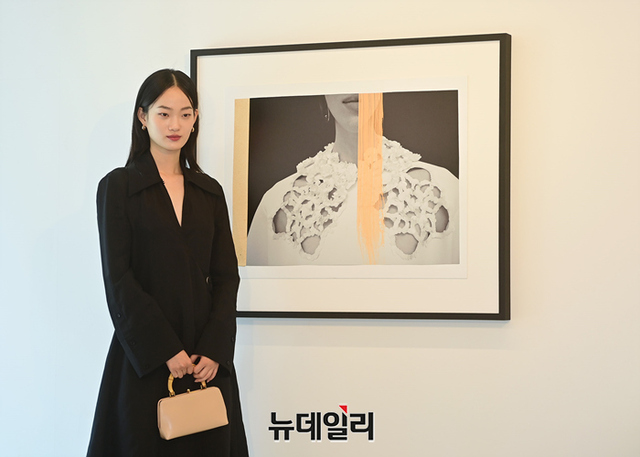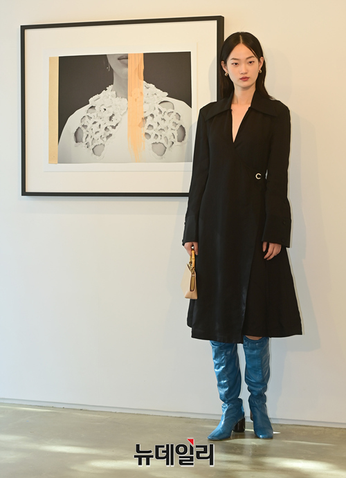 모델 신현지가 2일 오후 서울 종로구의 한 갤러리에서 열린 패션 브랜드 질 샌더 캠페인 쇼케이스에 참석해 포즈를 취하고 있다. 이번 전시는 크리스 로즈가 촬영하고, 카트린 드 블라워가 재구성한 질 샌더 2002 프리폴 컬렉션을 담은 캠페인 쇼케이스다.