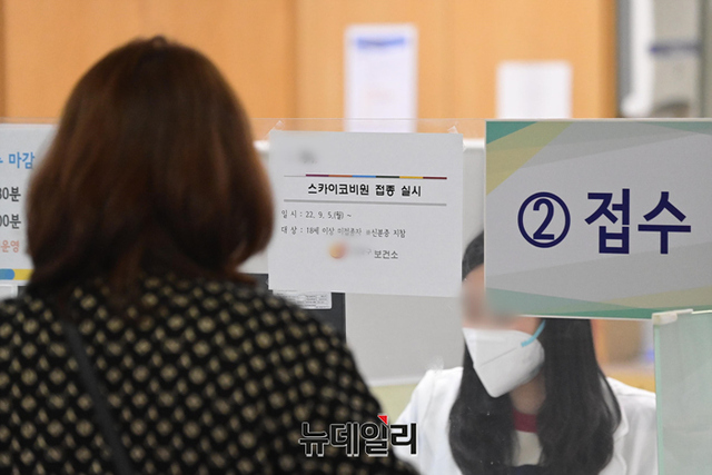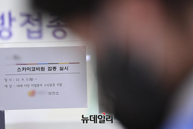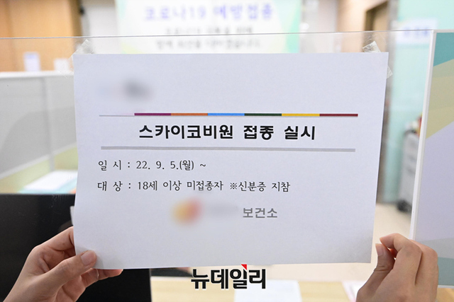 SK바이오사이언스가 개발한 '스카이코비원멀티주(이하 스카이코비원)' 백신 접종을 실시한 5일 오후 서울도심의 한 보건소에서 직원이 백신접종 안내문을 부착하고 있다.