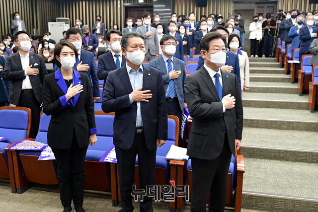 이재명 더불어민주당 대표 및 소속 의원들이 5일 국회에서 열린 비상 의원총회에서 국민의례를 하고 있다.
