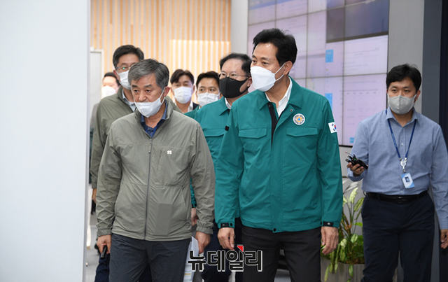 오세훈 서울시장이 5일 태풍대비 재난종합상황실을 방문해 시설을 둘러보고 있다. (사진=서울시)