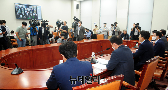 권성동 국민의힘 원내대표가 6일 국회에서 열린 시·도당 위원장 태풍피해 점검 화상회의에 참석해 발언을 하고 있다.