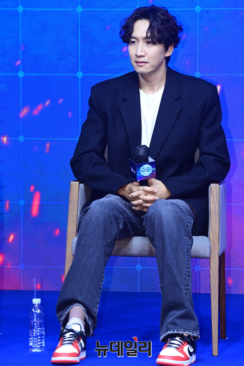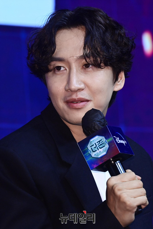 방송인 이광수가 6일 오전 서울 중구 웨스틴 조선호텔에서 열린 디즈니+ 오리지널 새 예능 '더 존:버텨야 산다(연출 조효진, 김동진)' 제작발표회에서 취재진의 질문을 듣고 있다.