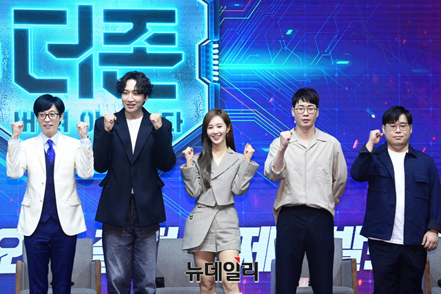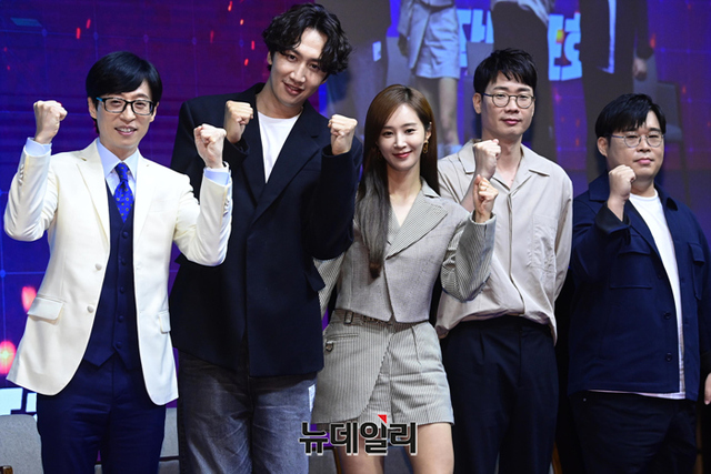 방송인 유재석(왼쪽부터), 이광수, 권유리, 연출 조효진, 김동진이 6일 오전 서울 중구 웨스틴 조선호텔에서 열린 디즈니+ 오리지널 새 예능 '더 존:버텨야 산다' 제작발표회에서 포즈를 취하고 있다.