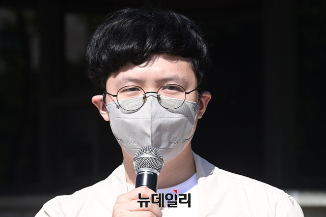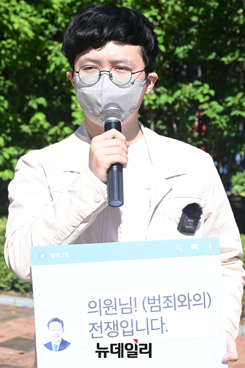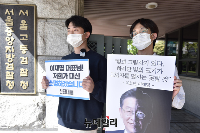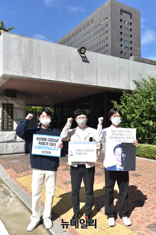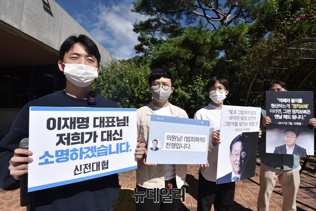 대학생단체 신전대협이 6일 오전 서울 서초구 서울중앙지검 앞에서 열린 공직선거법상 허위사실 공표 혐의로 고발된 이재명 더불어민주당 대표 관련 대리 소명 기자회견에서 구호를 외치고 있다.이들은 "이 대표가 故 김문기 처장을 성남시장 시절에 몰랐다고 주장한 것은 명백한 허위 발언이다"며 "이미 수많은 사진과 영상 자료 증거들이 남아 있다"고 주장했다. 이어 검찰에 "엄중한 사법적 판단을 기대한다"고 말했다.이 대표는 이날 검찰의 소환조사에 당론에 따라 응하지 않고 서면조사로 대체했다.