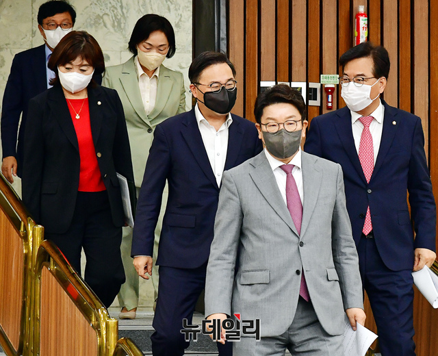 권성동 국민의힘 원내대표와 지도부가 7일 오전 국회에서 열린 원내대책회의에서 참석하기 위해 입장하고 있다.