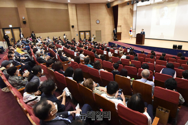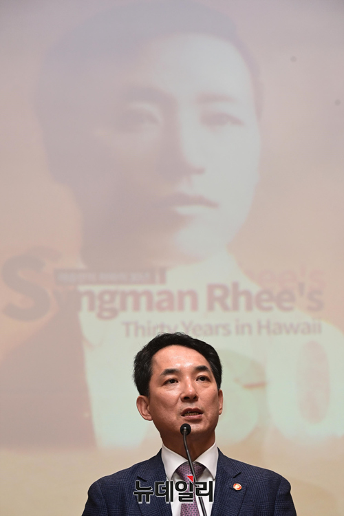 박민식 국가보훈처장이 7일 오후 서울 여의도 국회의원회관에서 열린 다큐멘터리 '이승만의 하와이 30년' 시사회에서 축사를 하고 있다.'이승만의 하와이 30년'은 이승만 대통령이 하와이에서 25년간 독립운동을 한 내용과 하야 후 5년 간의 하와이 생활을 그린 다큐멘터리다.11월 개최되는 하와이 국제영화제에 출품된 이번 다큐멘터리는 영화제 이후 미국 내 한인 지상파 채널 KBFD TV와 미국 전국 위성방송 채널 TAN TV에서 방영될 예정이다. 국내에서는 케이블TV를 통해 방영된다.