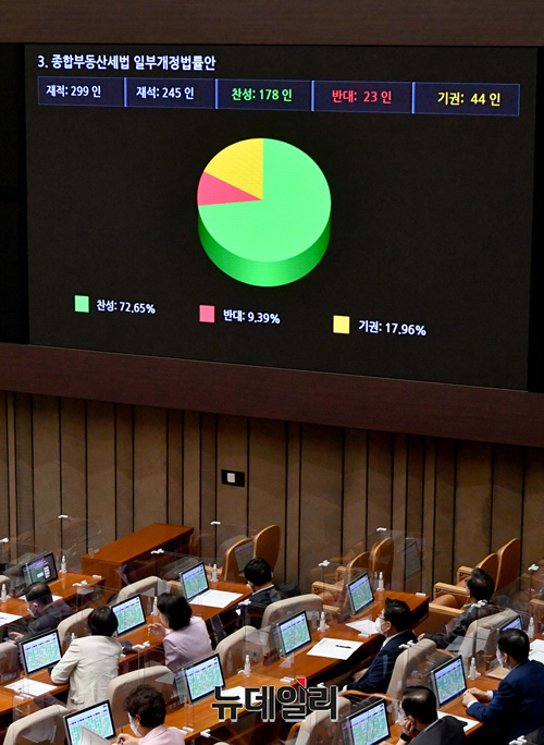 종합부동산세법 일부개정법률안이 7일 국회에서 열린 본회의에서 가결되고 있다. (공동취재사진)