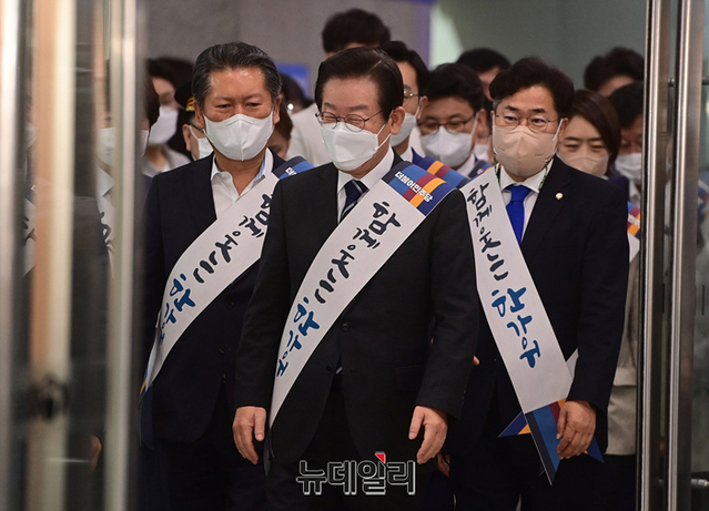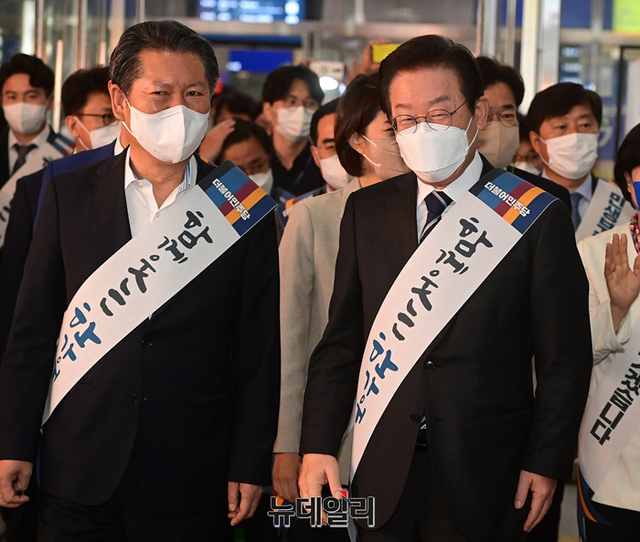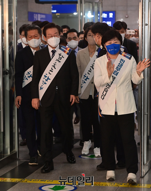 이재명 더불어민주당 대표와 지도부가 8일 오전 서울 용산역을 찾아 추석 귀성인사 하기 위해 이동하고 있다.