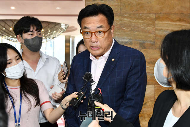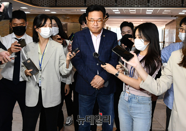 국민의힘 비상대책위원장에 내정된 정진석 국회부의장이 8일 오전 국회에서 기자들의 질문에 답하고 있다.