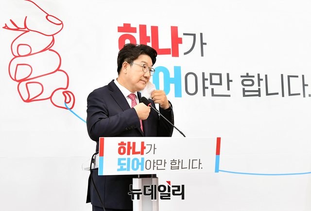 권성동 국민의힘 원내대표가 8일 오후 국회에서 열린 원내대표 사퇴 기자회견에서 마스크를 벋고 있다.