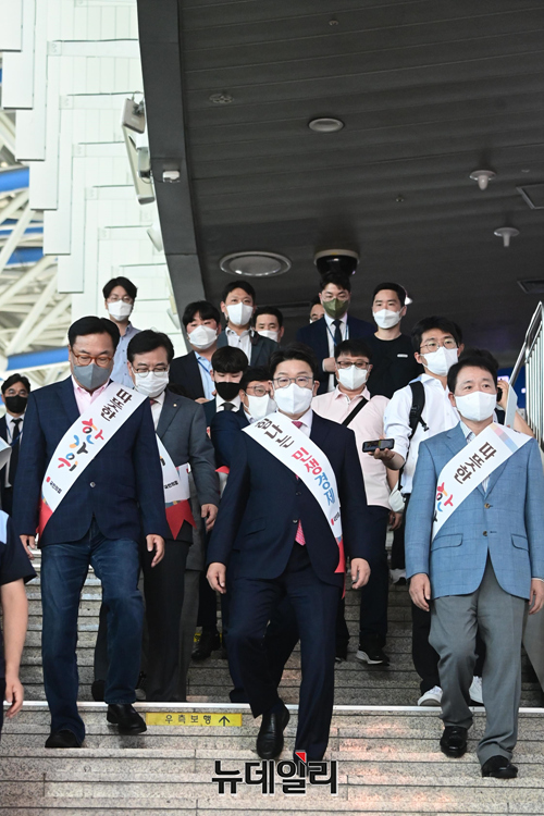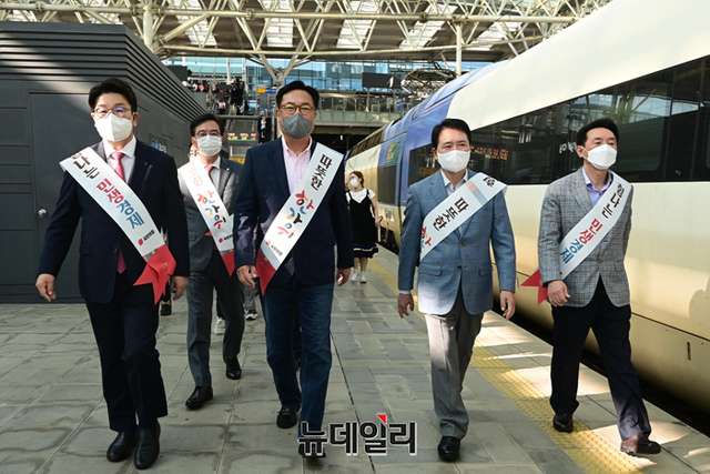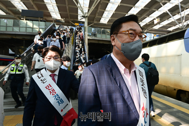 국민의힘 새 비상대책위원장에 임명된 정진석 국회부의장(왼쪽부터)과 권성동 원내대표, 성일종 정책위의장을 비롯한 지도부가 8일 오후 서울역에서 귀성객들에게 인사를 하기 위해 이동하고 있다.