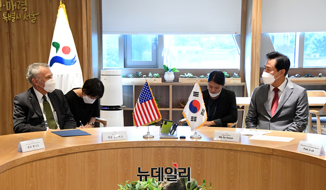 오세훈 서울시장이 8일 오후 서울시청 집무실에서 필립 골드버그 신임 주한미국대사를 만나 기념촬영을 하고 있다. 이들은 인플레이션 감축법(IRA) 현안에 대해 논의했다. (사진=서울시)