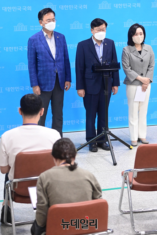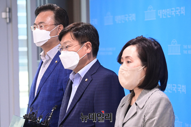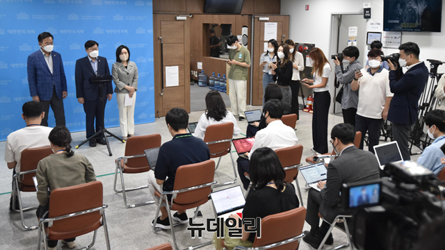 국회 법제사법위원회 여당 간사인 정점식 국민의힘 의원을 비롯한 유상범 의원, 전주혜 의원이 13일 오전 국회 소통관에서 이원석 검찰총장 후보자에 대한 인사청문보고서 채택을 촉구하는 기자회견 직후 취재진의 질문에 답하고 있다.