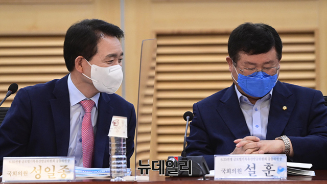 성일종 국민의힘 의원(왼쪽)과 설훈 더불어민주당 의원이 13일 오후 국회 의원회관에서 열린 6.25전쟁 글로벌기록유산발굴위원회 출범기념 토론회에서 대화를 나누고 있다.