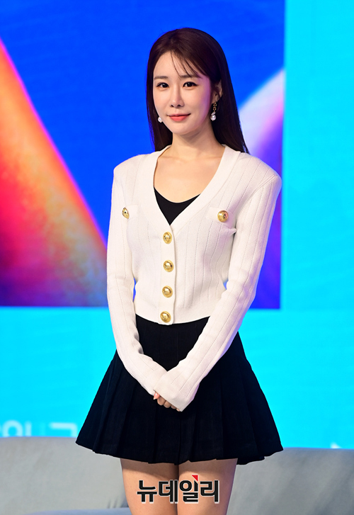 배우 유인나가 14일 오전 서울 여의도 콘래드 서울에서 열린 쿠팡플레이 첫 번째 예능 '체인리액션(연출 김용대)' 제작보고회에서 인사말을 하고 있다.