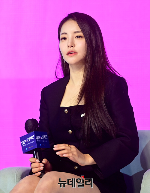 브레이브걸스 유정이 14일 오전 서울 여의도 콘래드 서울에서 열린 쿠팡플레이 첫 번째 예능 '체인리액션(연출 김용대)' 제작보고회에서 인사말을 하고 있다.
