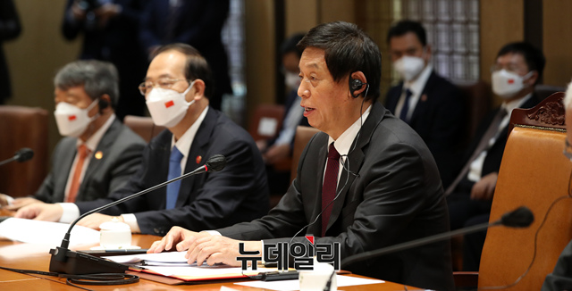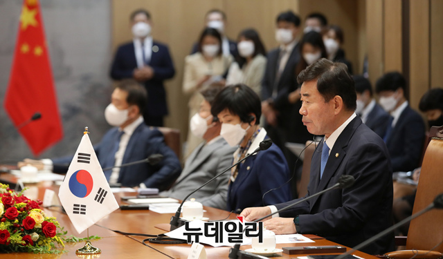 김진표 국회의장과 리잔수 중국 전국인민대표대회 상무위원장이 16일 국회에서 회담을 갖고 있다. (공동취재단)
