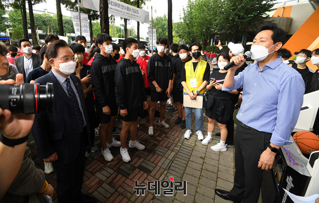 오세훈 서울시장이 17일 오전 서울 송파구 잠실실내체육관에서 열린 '2022 서울시민체육대축전' 개막식에 참석해 농구게임을 시연하고 있다.