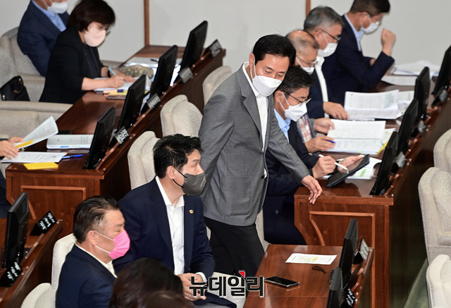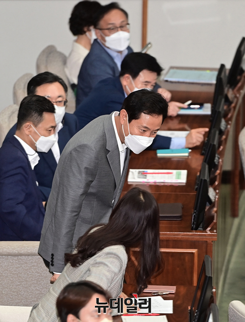 오세훈 서울시장이 19일 오전 서울 중구 서울시의회에서 열린 제314회 임시회 제4차 본회의에 입장하고 있다.