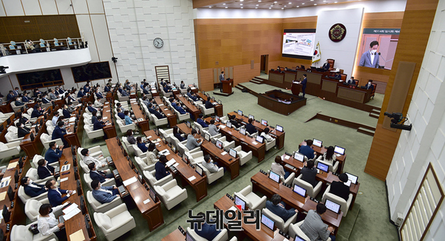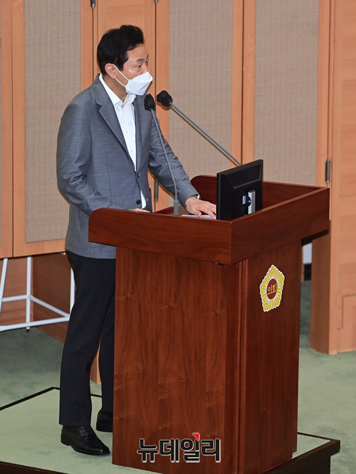 오세훈 서울시장이 19일 오전 서울 중구 서울 중구 서울시의회에서 열린 제314회 임시회 제4차 본회의에서 장태용 의원에게 태양광 지원사업과 관련해 질의를 받고 있다.