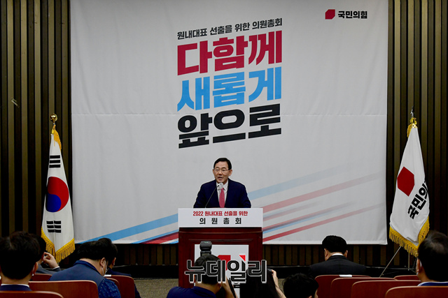 신임 국민의힘 원내대표로 선출된 주호영 의원이 19일 오전 국회에서 열린 의원총회에서 당선소감을 밝히고 있다.