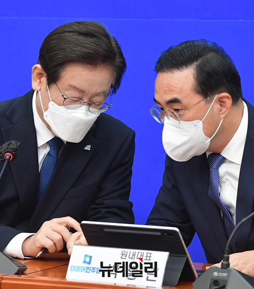 이재명 더불어민주당 대표와 박홍근 원내대표가 19일 오전 국회에서 열린 최고위원회의에서 대화를 나누고 있다.