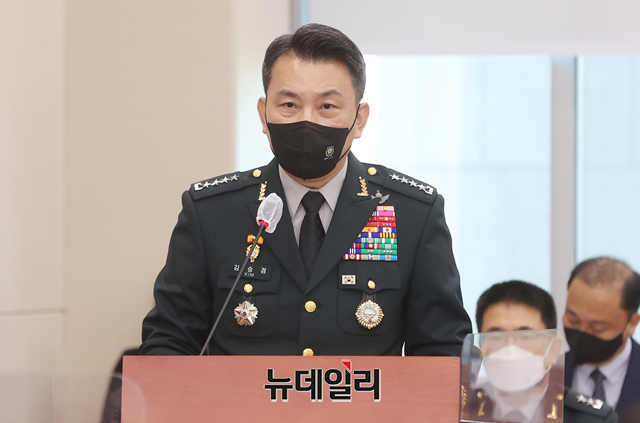 김승겸 합동참모의장이 19일 오전 국회에서 열린 국방위원회 전체회의에서 인사말을 하고 있다. (공동취재사진)