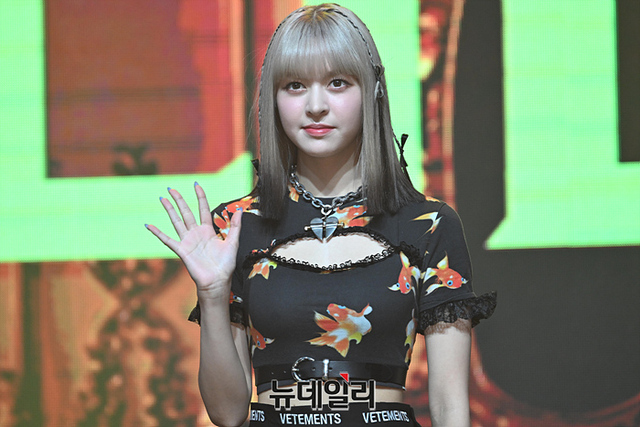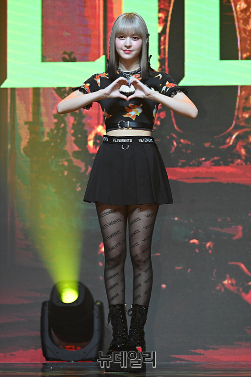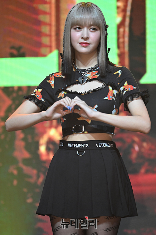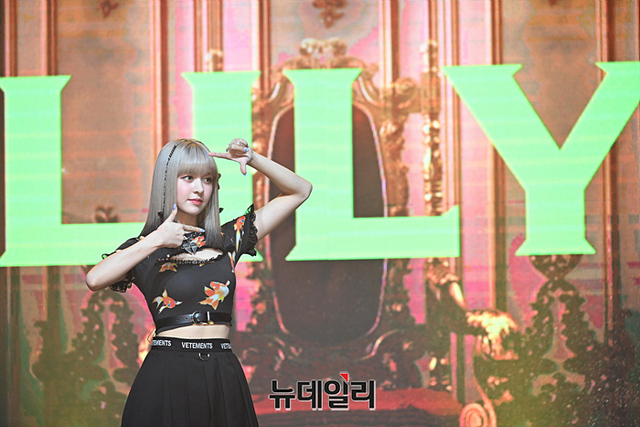 걸그룹 엔믹스 멤버 릴리가 19일 오후 서울 광진구 예스24라이브홀에서 열린 두 번째 싱글앨범 '엔트워프(ENTWURF)' 발매 기념 쇼케이스에서 포즈를 취하고 있다.