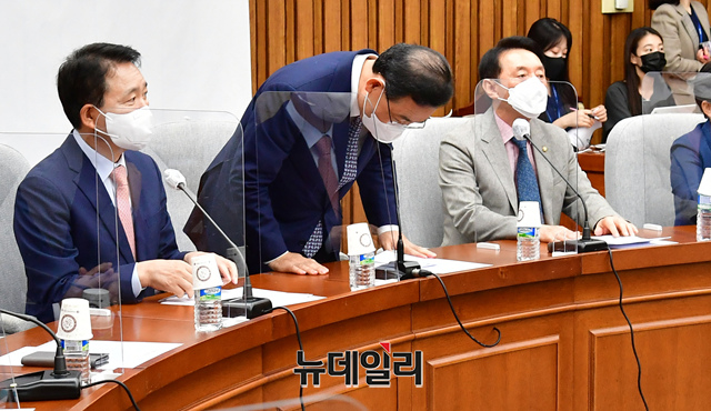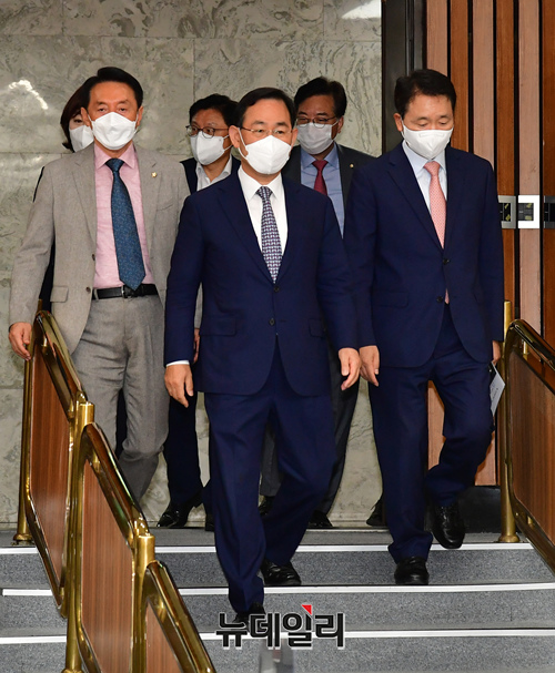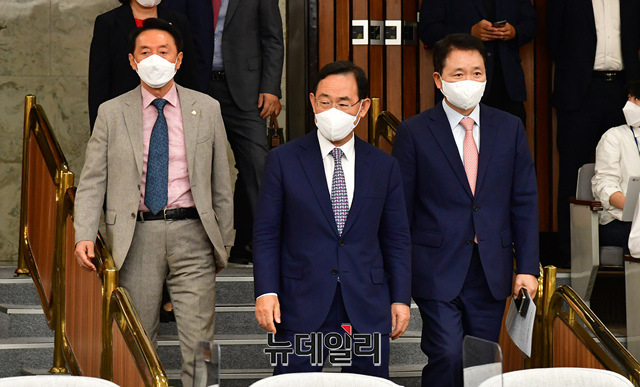 주호영 국민의힘 원내대표가 20일 오전 국회에서 열린 원내대책회의에 참석하기 위해 입장하고 있다.