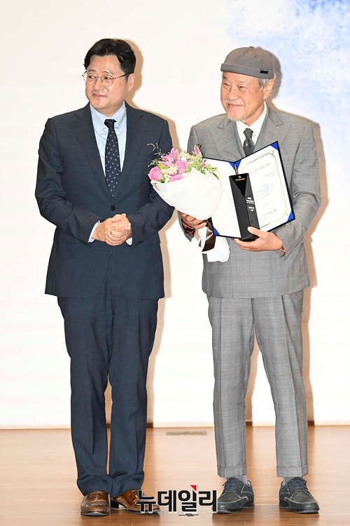 홍익표 더불어민주당 의원이 20일 오전 서울 국회의원회관에서 열린 2022 국가브랜드대상 시상식에서 코로나 확진으로 불참한 배우 이정재를 대신해 이장호 감독에게 국가브랜드 대상을 시상하고 있다.'국가브랜드 대상'은 매년 문화, 예술, 스포츠 등 각 분야에서 대한민국을 빛낸 사람에게 공로를 인정해 시상하는 행사다.올해는 국가브랜드 대상 수상자는 배우 이정재, 최민정 쇼트트랙 선수, 임윤찬 피아니스트이며 국가브랜드 한류 공로상은 배우 이영애, 특별상엔 전인건 간송미술관장이 선정됐다.