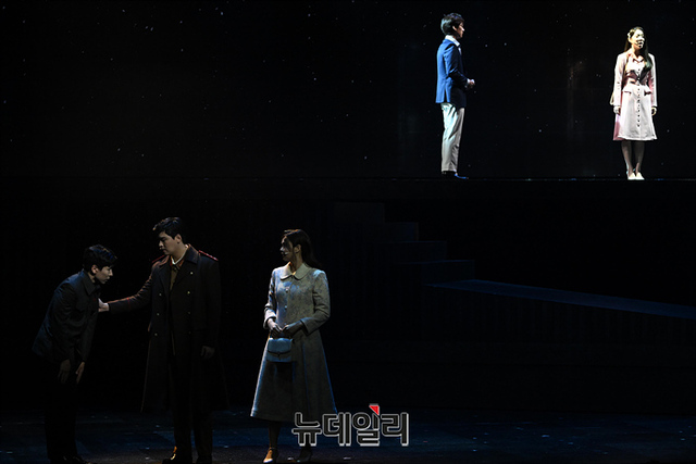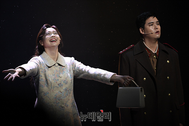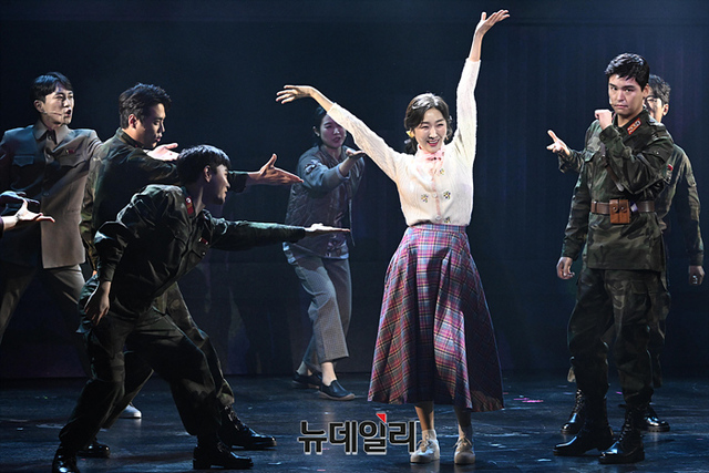 배우들이 20일 오후 서울 강남구 코엑스 신한카드 아티움에서 열린 뮤지컬 '사랑의 불시착(연출 박지혜)' 프레스콜에서 '우리의 정혁동무' 하이라이트 장면을 시연하고 있다.뮤지컬 '사랑의 불시착'은 2020년 방영된 현빈·손예진 주연의 tvN 동명드라마를 원작으로 제작했다.어느 날 돌풍과 함께 패러글라이딩 사고로 북한에 불시착한 재벌 상속녀 윤세리와 그녀를 숨기고 지키다 사랑하게 된 특급 장교 리정혁의 사랑 이야기를 그린다. 11월 13일까지 코엑스 신한카드 아티움에서 공연.