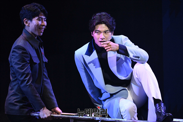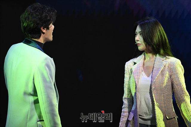 구승준 역을 맡은 배우 이이경, 서단 역을 맡은 배우 송주희가 20일 오후 서울 강남구 코엑스 신한카드 아티움에서 열린 뮤지컬 '사랑의 불시착(연출 박지혜)' 프레스콜에서 '연애란 이렇게 하는 것' 하이라이트 장면을 시연하고 있다.뮤지컬 '사랑의 불시착'은 2020년 방영된 현빈·손예진 주연의 tvN 동명드라마를 원작으로 제작했다.어느 날 돌풍과 함께 패러글라이딩 사고로 북한에 불시착한 재벌 상속녀 윤세리와 그녀를 숨기고 지키다 사랑하게 된 특급 장교 리정혁의 사랑 이야기를 그린다. 11월 13일까지 코엑스 신한카드 아티움에서 공연.