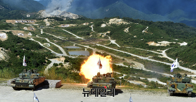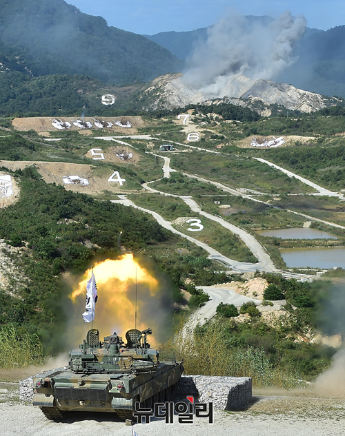 우리 육군이 20일 오후 경기 포천시 승진과학화훈련장에서 대규모 기동화력 훈련 현장을 공개한 가운데 K-2 흑표 전차가 발포하고 있다.이번 훈련 공개는 21일부터 일산 킨텍스에서 열리는 '대한민국 방위산업전시회(DX KOREA 2022)' 사전 행사의 일환으로 진행됐다.육군이 기동화력 시범을 재개한 것은 2018년 이후 4년 만이다. 유·무인 복합전투체계 아미타이거를 적용한 대규모 기동화력 시범을 선보인 것은 이번이 처음이다.박정환 육군참모총장 주관으로 열린 행사에는 해외 25개국 장성급 인사를 비롯한 국방 관료 및 방위산업 관계자, 주한대사, 국방무관, 국회 관계자, 일반 국민 등 1,800여 명이 참석했다. (경기 포천=정상윤 기자)
