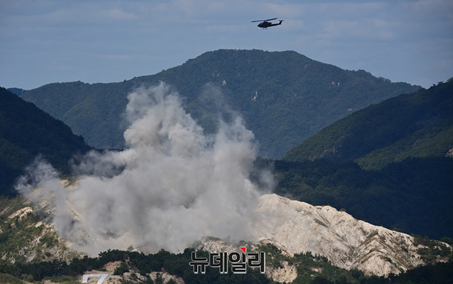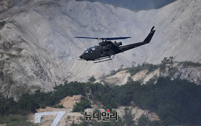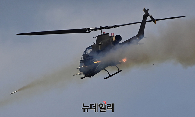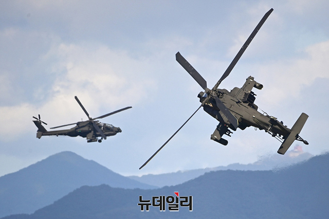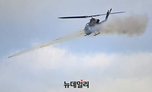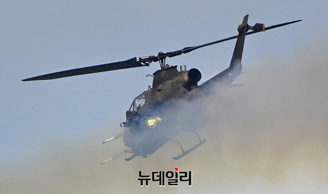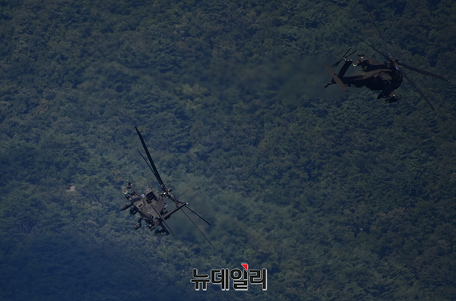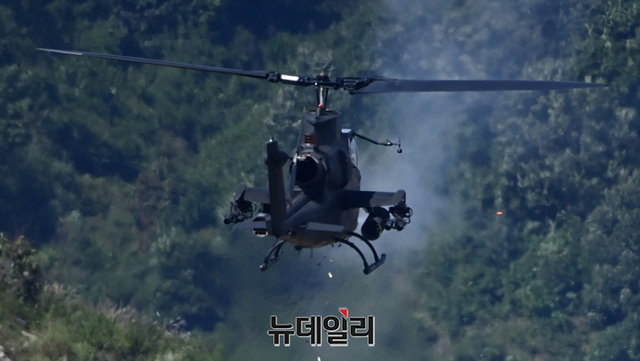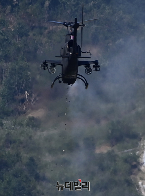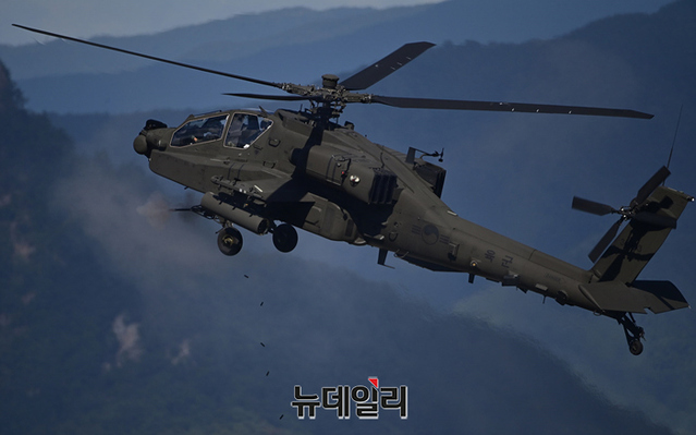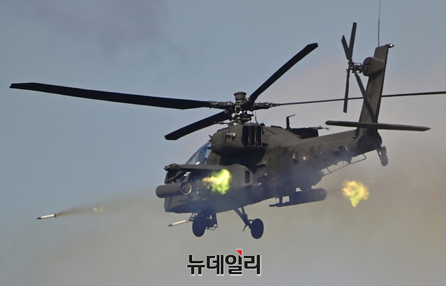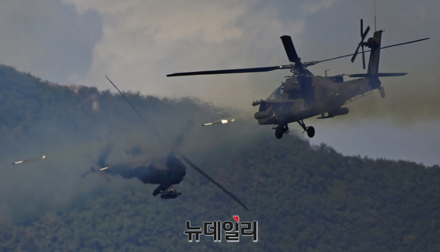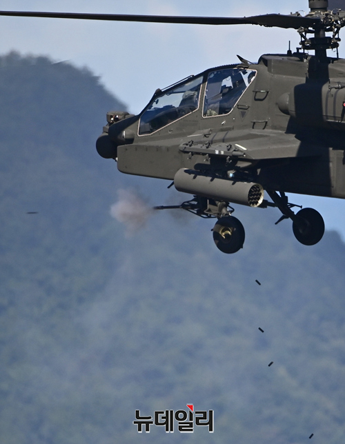 우리 육군이 20일 오후 경기 포천시 승진과학화훈련장에서 대규모 기동화력 훈련 현장을 공개한 가운데 아파치 헬기가 사격을 하고 있다.육군이 기동화력 시범을 재개한 것은 2018년 이후 4년 만이다. 유·무인 복합전투체계 아미타이거를 적용한 대규모 기동화력 시범을 선보인 것은 이번이 처음이다.박정환 육군참모총장 주관으로 열린 행사에는 해외 25개국 장성급 인사를 비롯한 국방 관료 및 방위산업 관계자, 주한대사, 국방무관, 국회 관계자, 일반 국민 등 1,800여 명이 참석했다.이번 훈련 공개는 21일부터 일산 킨텍스에서 열리는 '대한민국 방위산업전시회(DX KOREA 2022)' 사전 행사의 일환으로 진행됐다. 방위산업전시회는 21일부터 25일까지 일산 킨텍스 실내외 전시장에서 진행된다. (경기 포천=정상윤 기자)