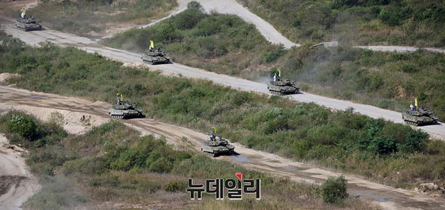 우리 육군이 20일 오후 경기 포천시 승진과학화훈련장에서 대규모 기동화력 훈련 현장을 공개한 가운데 K-2 흑표 전차가 포탄을 발사하고 있다.육군이 기동화력 시범을 재개한 것은 2018년 이후 4년 만이다. 유·무인 복합전투체계 아미타이거를 적용한 대규모 기동화력 시범을 선보인 것은 이번이 처음이다.박정환 육군참모총장 주관으로 열린 행사에는 해외 25개국 장성급 인사를 비롯한 국방 관료 및 방위산업 관계자, 주한대사, 국방무관, 국회 관계자, 일반 국민 등 1,800여 명이 참석했다.이번 훈련 공개는 21일부터 일산 킨텍스에서 열리는 '대한민국 방위산업전시회(DX KOREA 2022)' 사전 행사의 일환으로 진행됐다. 방위산업전시회는 21일부터 25일까지 일산 킨텍스 실내외 전시장에서 진행된다. (경기 포천=정상윤 기자)