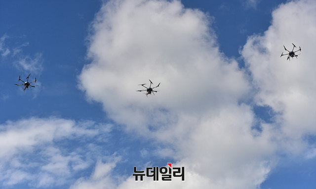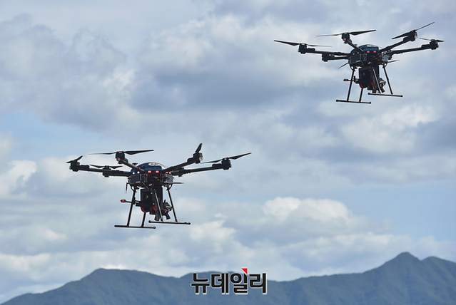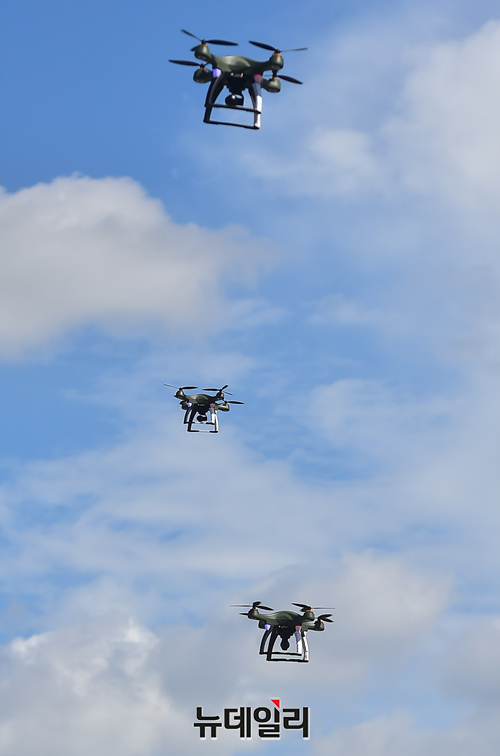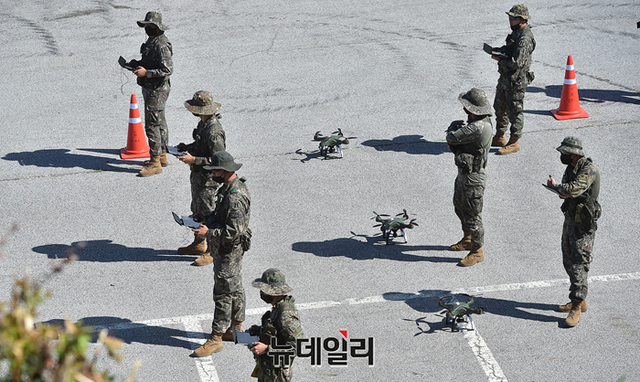 우리 육군이 20일 오후 경기 포천시 승진과학화훈련장에서 대규모 기동화력 훈련 현장을 공개한 가운데 공중정찰중대 드론이 적진을 탐색하고 있다.육군이 기동화력 시범을 재개한 것은 2018년 이후 4년 만이다. 유·무인 복합전투체계 아미타이거를 적용한 대규모 기동화력 시범을 선보인 것은 이번이 처음이다.박정환 육군참모총장 주관으로 열린 행사에는 해외 25개국 장성급 인사를 비롯한 국방 관료 및 방위산업 관계자, 주한대사, 국방무관, 국회 관계자, 일반 국민 등 1,800여 명이 참석했다.이번 훈련 공개는 21일부터 일산 킨텍스에서 열리는 '대한민국 방위산업전시회(DX KOREA 2022)' 사전 행사의 일환으로 진행됐다. 방위산업전시회는 21일부터 25일까지 일산 킨텍스 실내외 전시장에서 진행된다. (경기 포천=정상윤 기자)
