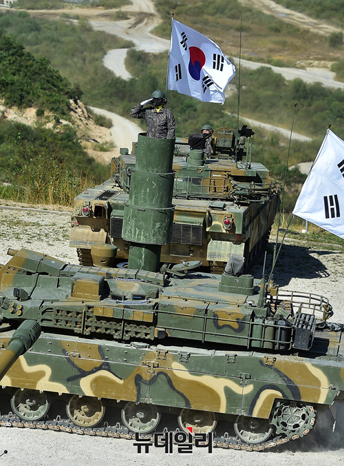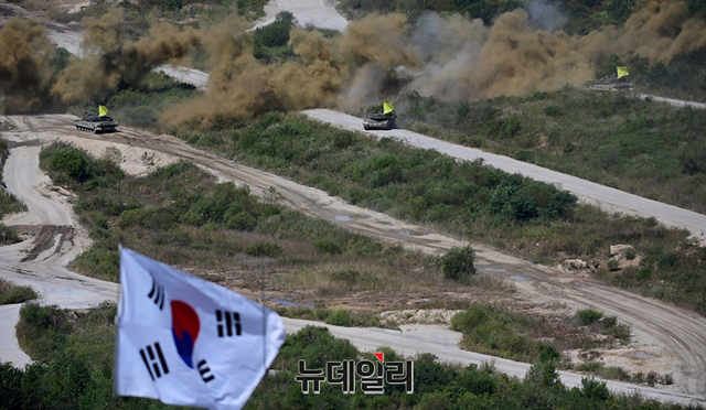 우리 육군이 20일 오후 경기 포천시 승진과학화훈련장에서 대규모 기동화력 훈련 현장을 공개했다.육군이 기동화력 시범을 재개한 것은 2018년 이후 4년 만이다. 유·무인 복합전투체계 아미타이거를 적용한 대규모 기동화력 시범을 선보인 것은 이번이 처음이다.박정환 육군참모총장 주관으로 열린 행사에는 해외 25개국 장성급 인사를 비롯한 국방 관료 및 방위산업 관계자, 주한대사, 국방무관, 국회 관계자, 일반 국민 등 1,800여 명이 참석했다.이번 훈련 공개는 21일부터 일산 킨텍스에서 열리는 '대한민국 방위산업전시회(DX KOREA 2022)' 사전 행사의 일환으로 진행됐다. 방위산업전시회는 21일부터 25일까지 일산 킨텍스 실내외 전시장에서 진행된다. (경기 포천=정상윤 기자)
