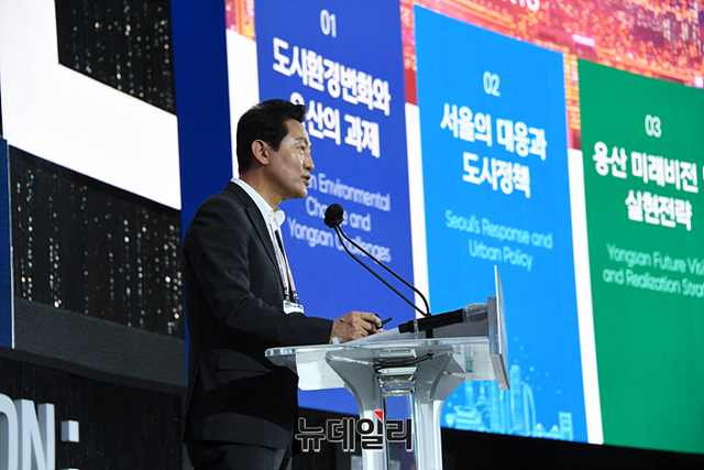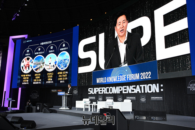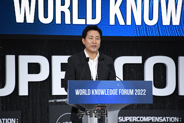 오세훈 서울시장이 20일 오후 서울 중구 장충체육관에서 진행된 제23회 세계지식포럼 '용산 르네상스:용산과 미래도시' 회의에서 '용산의 미래 비전' 주제로 발표를 하고 있다.