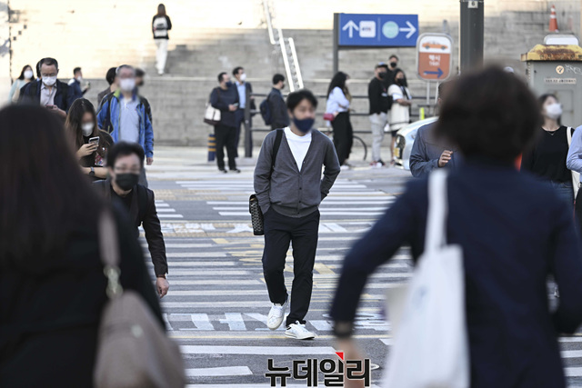 전국이 맑고 선선한 가을 날씨를 보이고 있는 21일 오전 서울도심에서 시민들이 외투를 입고 이동하고 있다. 기상청은 이날 전국이 대체로 맑은 가운데 동해안과 남해안, 제주도는 가끔 구름이 많을 것으로 전망했다.