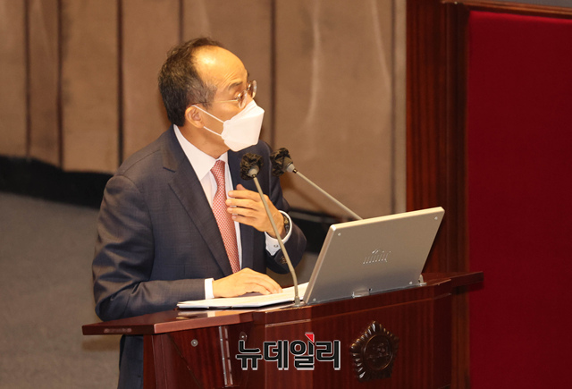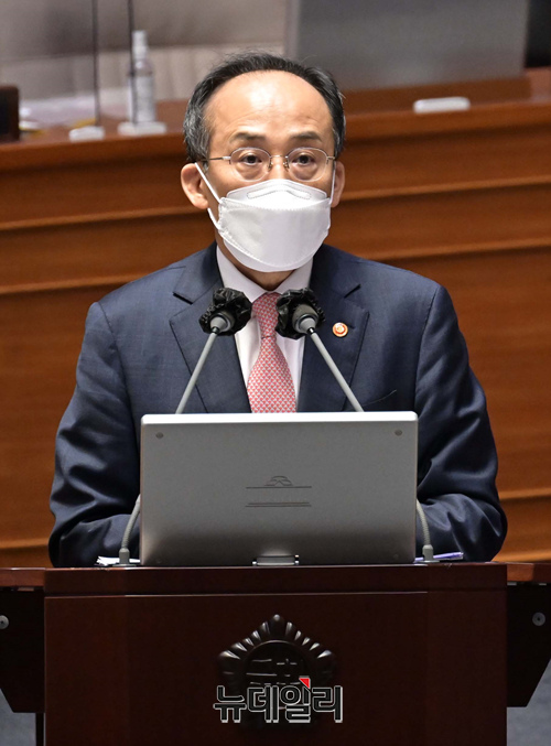 추경호 부총리 겸 기획재정부 장관이 21일 국회에서 본회의장에서 열린 경제에 관한 대정부질문에서 의원들의 질문에 답변하고 있다. (공동취재사진)